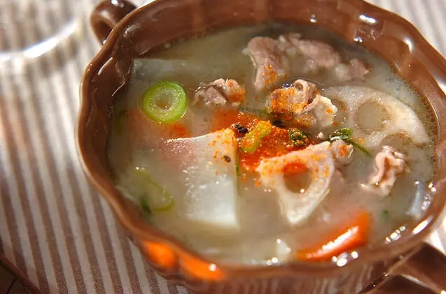 豚汁に豆乳を加えることで、コクとまろやかさをプラス。シャキシャキとしたキムチが味のアクセントになります。キムチは煮込むのではなく、出来上がった豚汁を器に注いでから、のせてください。
