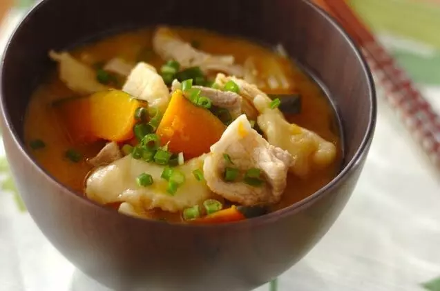 つるつる、もちもちとした食感のすいとんが入った具だくさんの豚汁。煮崩れたカボチャがほんのり甘くておいしいです。すいとんは、耳たぶくらいのやわらかさになるように、水を調節してください。