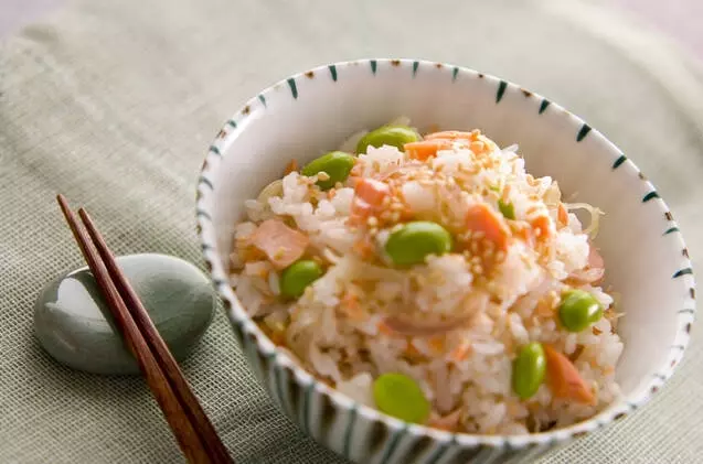 鮭のオレンジ色と枝豆の黄緑色の彩りきれいな混ぜご飯です。お魚も取り入れたい時は、この混ぜご飯がおすすめです。豚汁に負けない、しっかりとした味わいで食べ応えもあります。おにぎりにしても♪