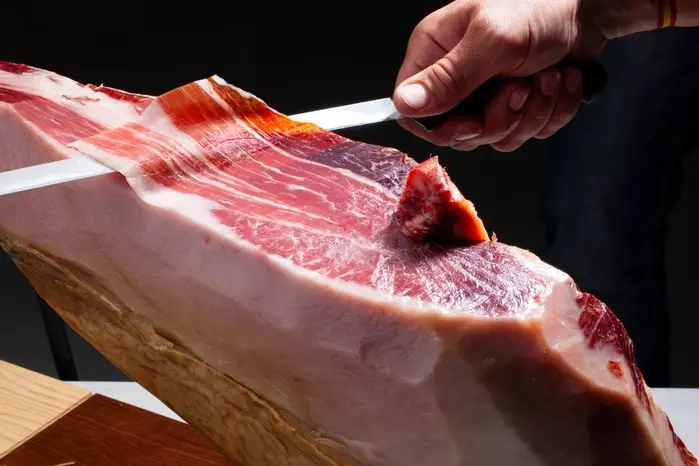 柔らかい食感で絶妙な塩気と旨味がある生ハム。生ハムは豚のモモ肉を塩漬けして乾燥・熟成したもの。「生肉」ではなく長期保存するための塩漬け肉でお店で見かけるモモ肉のかたまりは「原木」と呼ばれています。一方「ハム」は塩漬け、乾燥を経て「加熱処理」されるところが大きく違う点。