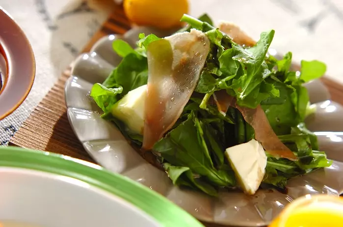 ハーブの一種のルッコラと生ハムを合わせたサラダ。オリーブオイルとバルサミコ酢のシンプルな味付けが素材の味を引き立たせています。パスタやグラタンの副菜にピッタリですよ。
