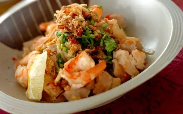 ベトナムのリゾート地ダナン名物の「ミークアン」は、日本のきしめんに近い太麺にタレをからませて食べる麺料理です。こちらのレシピでは、フォーを使ってミークアンを作ります。お好みの分量のトッピングをのせたら、器の底から麺をかき混ぜて召し上がりください。汁気が足らない場合は、水を加えましょう。