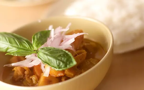 揚げたホクホクのサツマイモを加えるのがベトナム風です。歯ごたえがあり、旨味たっぷりな親地鶏との相性抜群! 仕上げにライムを絞ると、甘くて辛くてさわやかなアジアンカレーの出来上がりです。ジャスミンライスと一緒に食べると幸福度が増す一食に。