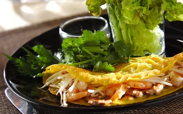 ベトナム南部が発祥とされる「バインセオ」。米粉やココナッツミルク、卵を混ぜたパリパリとした生地に肉や野菜、魚介を包んで食べます。胃の具合がイマイチのときにも最適です。香草による消化促進も期待できます。ひとくち大に切って、お好みの香草と一緒にサニーレタスで巻き、つけダレにつけて食べましょう。