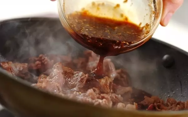 2、フライパンに分量外のゴマ油を入れ、強火にかける。牛肉を色が変わるまで炒めたら<ビビンバのタレ>を加え、炒め合わせる。別の器に汁ごと取り出す。