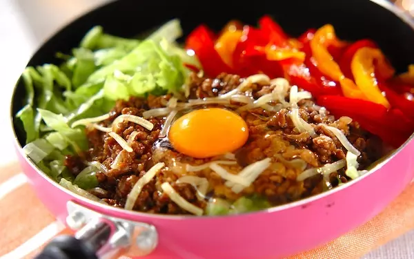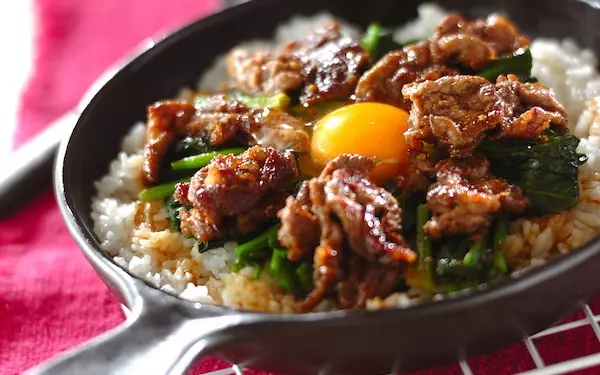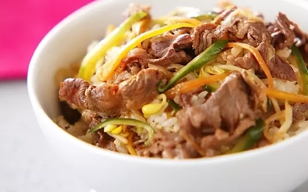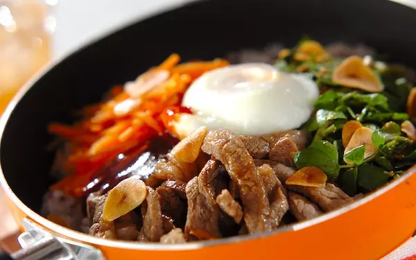 フライパンで作るビビンバ風焼き肉丼なら、忙しい昼にもササッと作ることができます。少しおこげができるくらいに仕上げましょう。卵をよく混ぜてから召し上がれ! 彩り鮮やかで食卓に華を添えてくれる一品です。子どもから大人まで美味しくお腹を満たせますよ。