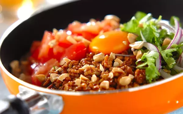 甘めの肉みそと香菜の香り、サッパリとしたトマトのナムルが絶妙なバランスのビビンバ。仕上げにお好みで、卵黄を盛り、ピーナッツを散らしましょう。韓国料理とエスニック料理が混ざったような味わい深さがポイント。一度食べるとくせになりそうです。
