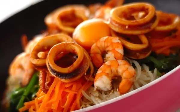 イカやエビを使った海鮮ビビンバもフライパンひとつでパパッと作れます。野菜もたっぷりで栄養満点! コチュジャンを抜いて、出来上がりに添えても美味しいです。フライパンのままテーブルに出せるので、手間いらず。家族でビビンバを囲み、楽しい時間を過ごしましょう。