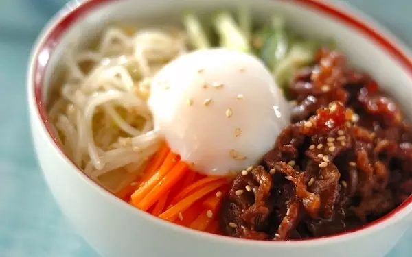 牛肉と野菜がたっぷりのったビビンバ風丼です。栄養バランスも抜群! 温泉卵を混ぜると、よりまろやかな味わいに。調味料のコチュジャンの量を調整することで、辛さ控えめに仕上げることができます。モヤシとニンジンのナムルは、前日に作っておくのもいいでしょう。