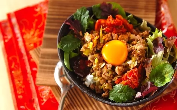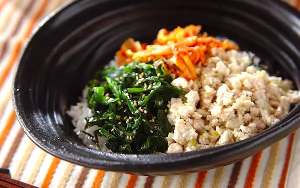そぼろとニラのナムル、キムチを豪快に混ぜて食べる美味しい一品です。卵黄をのせるのもオススメ。ごま油の香りが食欲をそそります。全体的にあっさりとした味わいのビビンバで食べやすいところも魅力。甘めの白菜キムチを使えば、子どもでも抵抗なく食べられそうです。