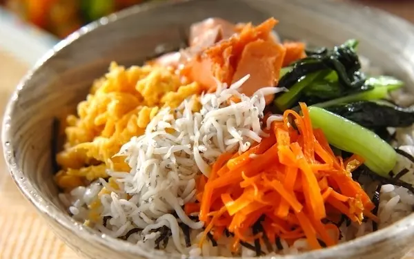 子どもがもりもりと食べる栄養バランスの良い和風ビビンバがこちら。塩鮭とシラスの塩味と、ゴマ油風味のナムルがご飯によく合います。小松菜、ニンジンの和え物は朝や前日に作っておけば、時短も可能です。見た目も鮮やかで、食欲をそそられます。