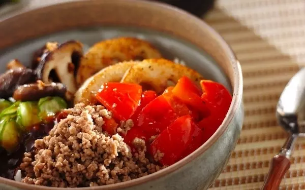 野菜がメインの具となったビビンバ丼です。ゴロッと入ったシイタケ、レンコン、赤パプリカは白ゴマ油とニンニクの風味が効いています。コチュジャンのピリ辛もアクセントに。よく混ぜてから召し上がれ! 赤パプリカはピーマンに代えてもいいでしょう。