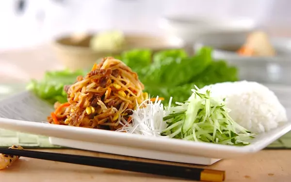 ビビンバを手巻きで味わうこちらの一品。「どんな味なの?」と思うかもしれませんが、サンチュにご飯をのせて、炒め合わせた肉と野菜、キュウリ、白髪ネギを巻くと、たまらない美味しさです。「こんな食べ方があったんだ」と新鮮な気持ちになれますよ。