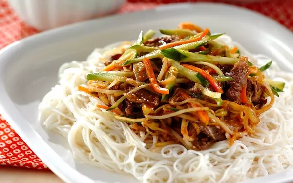 夜ご飯にガッツリと食べたいレシピがこちら。肉も野菜もたっぷりとれる、簡単ビビンバ風です。大好評の甘辛い味わいで、お箸が止まらない美味しさ。辛さを調整することで、子どもたちも安心して食べることができます。家庭の定番メニューに加えたくなりそうです。