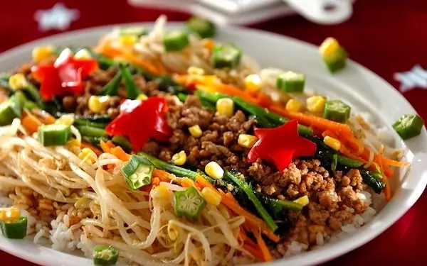 七夕の日以外も食べたくなるかわいらしい天の川ビビンバです。ビビンバの具を天の川に見立ててトッピング。赤パプリカを星型にくり抜いて飾れば、苦手な野菜も食べられそうですね。子どもと一緒に作るのもオススメ。大人が食べるときは、キムチをのせたり、コチュジャンを添えてもいいでしょう。