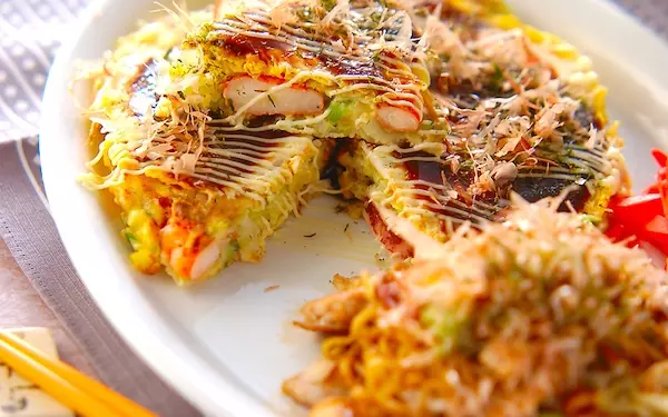 豚バラ肉、イカ、エビが入ったミックスお好み焼きです。衣に長芋を入れることで、生地がふわふわに。仕上げに、お好み焼きソース、マヨネーズをかけ、紅ショウガ、青のりを散らしましょう。子どもも大好きな一品です。ぜひお試しを。