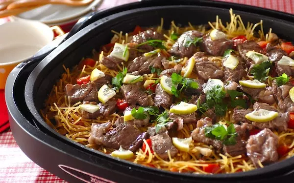 ホットプレートでパスタパエリアを作ってみませんか? ステーキの旨味が効いた華やかな料理です。仕上げに、レモンとイタリアンパセリを散らし、弱火で2~3分蒸らしてからいただきましょう。ステーキ用の牛肉の代わりに魚介を使っても、もちろんオッケーです。