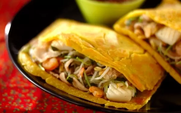 バインセオはベトナム風のお好み焼きです。ココナッツミルク入りでほのかに甘い生地は、モチモチ食感でやみつきになります。完成したら食べやすい大きさに切り、サニーレタスで巻いて、合わせたタレをつけてからいただきましょう。ビールのおつまみにもピッタリです。