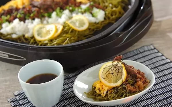 山口県の郷土料理のひとつ「瓦そば」。ホットプレートで作れば、家族みんなでワイワイと楽しみながら味わうことができます。茶そばは袋の指示より1分短くゆでるのがポイントです。牛肉、レモン、大根おろし、刻み青ネギ、刻みのりを彩りよく盛り、温めた麺つゆを添えましょう。野趣あふれるそばをご堪能ください。
