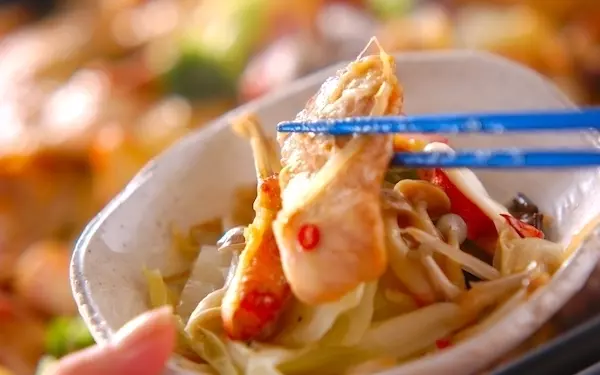 野菜と鮭をみそダレでいただくチャンチャン焼きです。辛いのが苦手な場合は、粉唐辛子を入れなくても構いません。最後にゆでうどんを入れ、焼うどんを作るのもオススメです。青ネギやニラを一緒に炒めると、より豊かな味わいに。