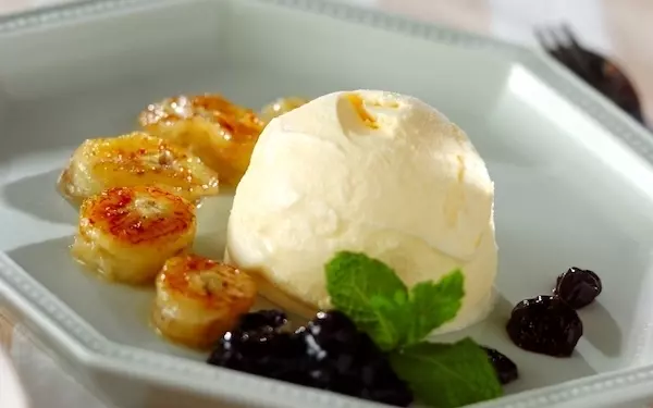 ホットプレートで作れる熱々のデザート。バナナをホットプレートで焼いて、冷たいアイスクリームを添えるだけで作れます。お好みで、ブルーベリージャムを添え、ミントの葉を飾りましょう。15分で作れるので子どものおやつとしても最適です。