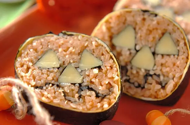 切るとジャックオーランタンが現れるケチャップライスで作るオムライス風の太巻きです。ハロウィンが盛り上がること間違いなしですね。