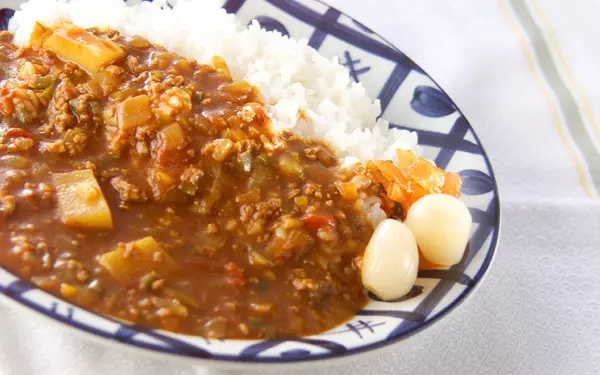 ひき肉と野菜の旨味がたっぷりとけ込んだ魅惑のレシピがこちら。トマト缶を加えれば、お店のような本格的な味わいに仕上がります。お好みで、ローストスライスアーモンド、ゆで卵、らっきょう、福神漬け、イカ塩辛などをトッピングするのも◎です。