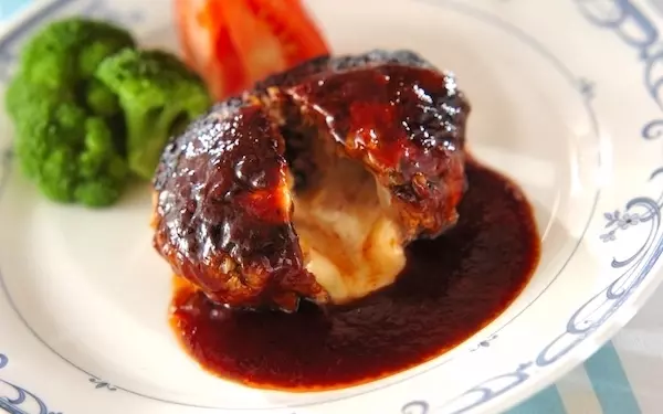 みんな大好きハンバーグの中から、たっぷりチーズがとろ~り。チーズが漏れないように肉だねの中心に包み、完全に覆うように整えてくださいね。定番のハンバーグソースにチーズがよく合います。一度、味わうとやみつきになる一品です。