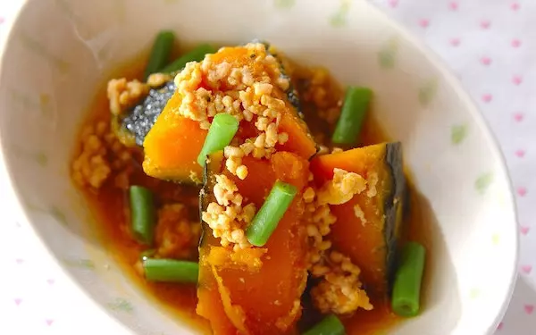 普段の煮物にひき肉をプラスするだけで、ボリュームアップを図れます。ホクホクなかぼちゃとひき肉のコラボをお楽しみください。かぼちゃは煮崩れないように中火でゆっくり炊きこむことがポイント。