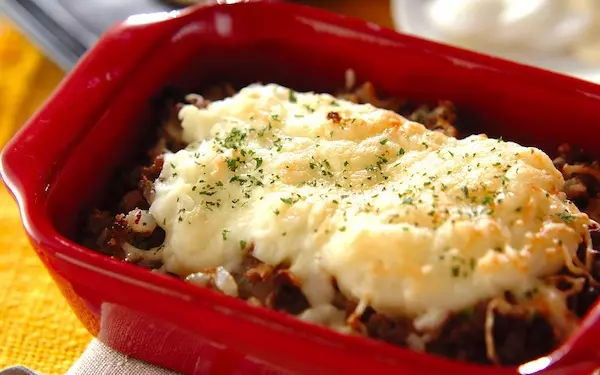 マッシュポテトと、炒めた合いびき肉を交互に重ねたグラタンです。まろやかなマッシュポテトと、こんがり焼けたチーズで、子どもが大好きな味に。ボリューム満点で美味しくお腹を満たせますよ。