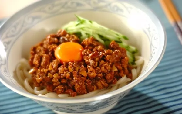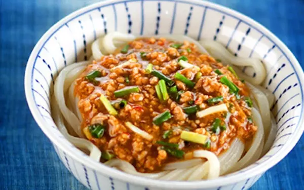 赤みそで甘辛に味つけした肉そぼろがたまらない一品です。冷凍うどんを使って、10分で完成します。お好みで、ラー油をかけてもいいでしょう。キュウリを添えたり、卵黄をのせて食べるのもアリです。