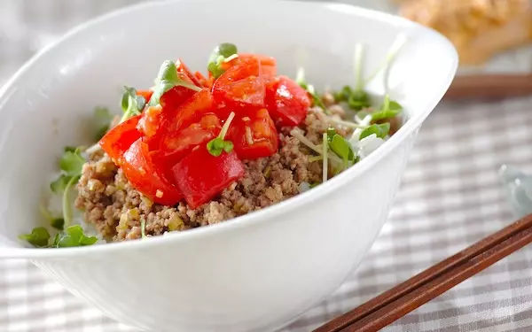 フルーツトマトとそぼろを合わせると、さっぱりとした味わいに。貝割れ菜を添えれば、見た目も華やかに。手軽に作れてボリューム満点です。忙しい日や休日ランチにもぜひ。