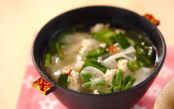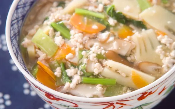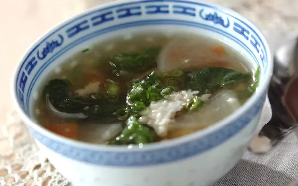 鶏ひき肉、大根、ニンジン、レタス、卵白を使ったあっさりとしたスープです。仕上げに、刻みネギをのせましょう。ショウガが効いていて、体がポカポカとしてきますよ。食欲がない日や風邪気味のときにもピッタリです。