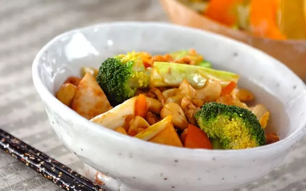 キャベツとカシューナッツの食感がアクセントになったユニークで美味しい炒め物です。豆板醤とウスターソース、味噌、砂糖のバランスが絶妙! キノコ類を加えてもいいかもしれません。何度も味わいたくなる一品です。
