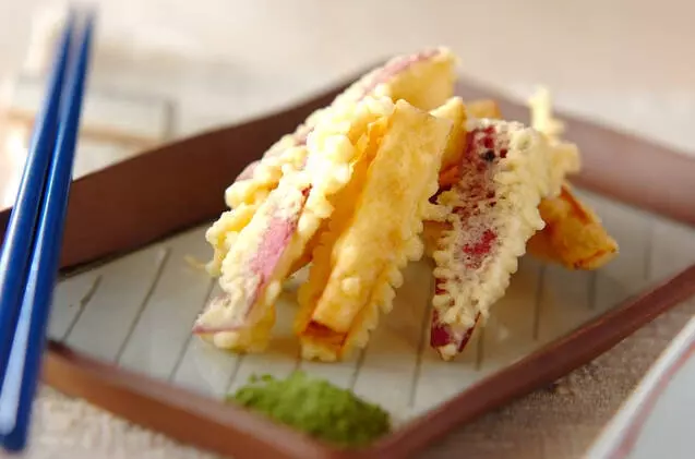 小麦粉と片栗粉を混ぜたてんぷら粉で、サクサクとした食感が作れますよ。ワンタンや餃子、シュウマイ等の皮が残っていたら、キツネ色になるくらいまで揚げて盛り合わせても! ほっくりのサツマイモとサクサクのワンタンを同時に楽しめますよ。
