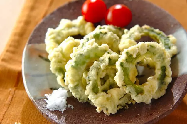 ビタミンCたっぷりで栄養満点のゴーヤを、輪切りにして天ぷらに。シンプルに塩でいただきます。ゴーヤは低カロリーなので、揚げてもヘルシーにいただけておすすめです。