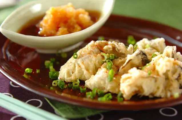 ぷりぷりのカキは天ぷらにしても美味しいですよね。そして、食卓が豪華になりますね。サクサクに揚げるコツは、サッと茹でたカキをキッチンペーパーでしっかり水気をふき取ることです。柚子醤油と薬味たっぷりでいただきましょう。