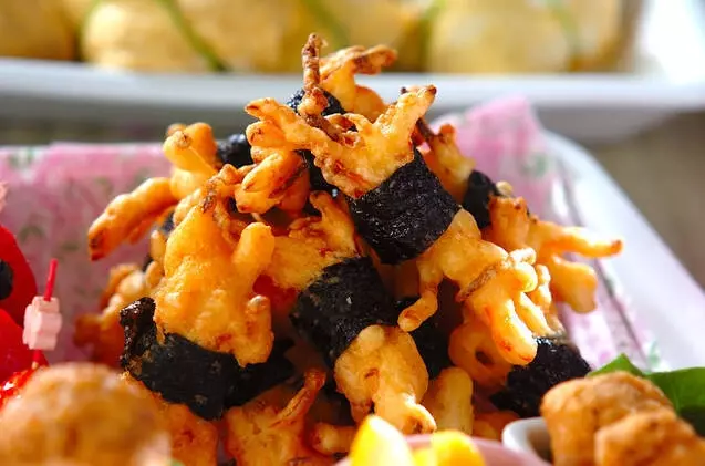 サキイカに海苔を巻いて揚げるレシピ。衣にマヨネーズを加えるのがポイントです!子どもに人気の天ぷらです。大人はおつまみにすると、ビールがさらに美味しくなる味わいに。大人も子どもも手が止まらぬ美味しさですよ。