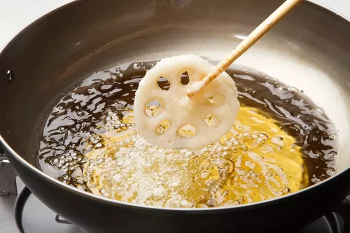 ほくほく、サクサクの歯ごたえがおいしいレンコンの天ぷら。レンコンは、3~4mmの輪切りにし、水にさらして水けを切ってから天ぷら衣に通しましょう。