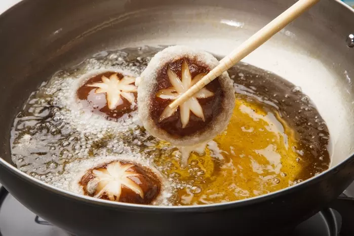 噛むとサクッとジューシーなシイタケの天ぷら。シイタケは軸を落として汚れを拭き取ったあと、笠に飾り切りにすると見た目が美しく食卓も華やかになります。飾り切りの方法は以下の動画を参考にしてください。
