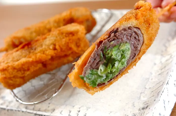 お肉の旨味と甘くてジューシーなネギが楽しめる串カツは、牛肉の代わりに豚肉でも◎。お好みでチーズを入れて楽しんでくださいね。