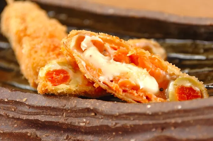 プロセスチーズをスモークサーモンで巻いて串カツに仕上げました。ピンチョスのようにオリーブをあしらえばお口直しになりますね。