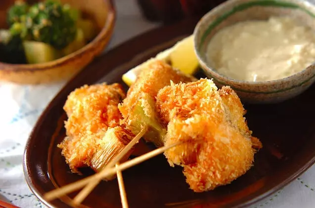 塩鮭とネギで作る串カツには白みそ仕立てのタルタル風ソースがよく合います。お弁当やお酒のお供にオススメです。魚が苦手なお子さんも喜びそう!