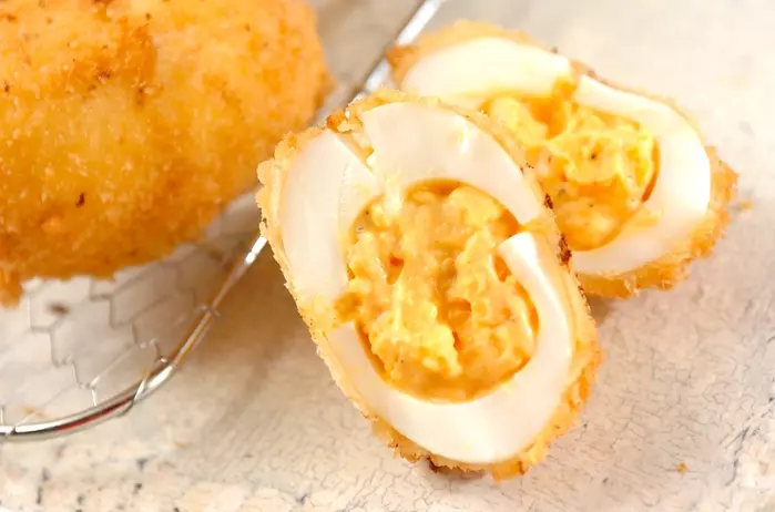 ゆで卵の中にホワイトソースを忍ばせた、食べてびっくりの串カツです。冷蔵庫に常備している卵で作るアイデアレシピ。