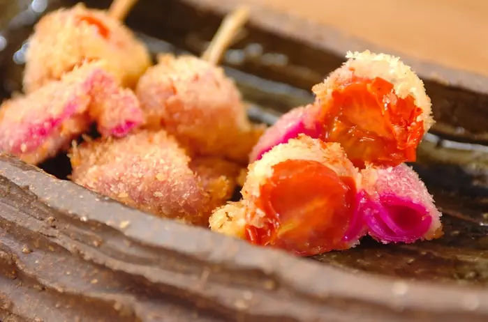 下町の定番紅しょうが天をアレンジした串カツは、プチトマトの酸味と紅しょうがの組み合わせが面白い!体を温めるショウガは寒くなる季節にピッタリです。