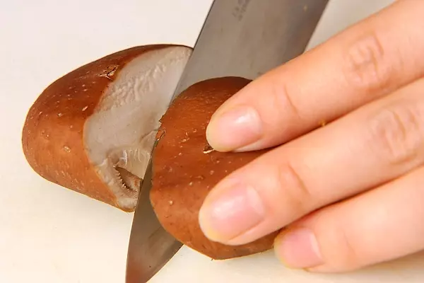 ・生シイタケは石づきを取り、堅く絞ったぬれ布巾で汚れを拭き取り、軸と傘に切り分ける。軸は縦半分に裂き、傘の大きいものは半分にそぎ切りにする。