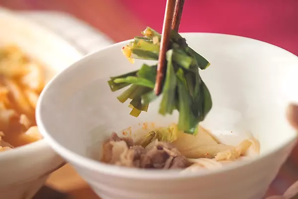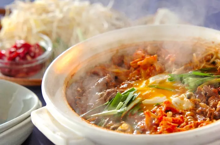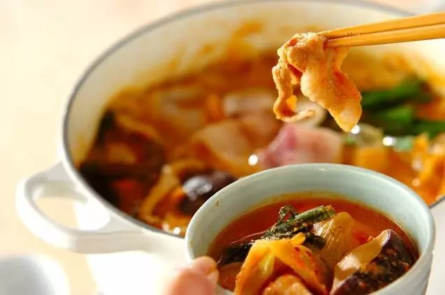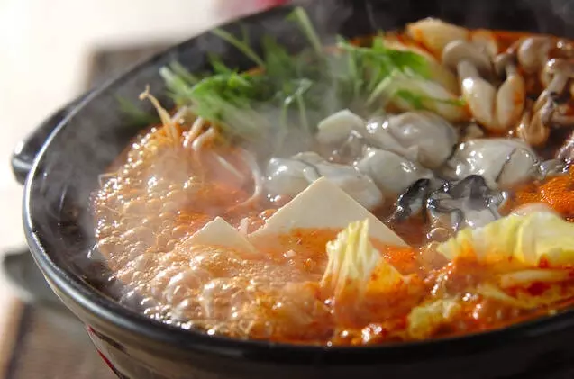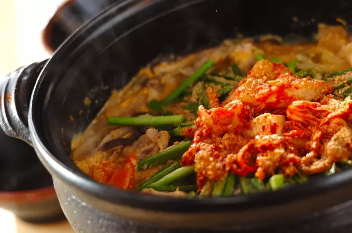 キムチとコチュジャンのピリ辛にとみそのコクが加わった深みのあるおいしいスープです。卵をくずせばとろりまろやかな味に変身します。体の中からホットになれて寒い日にはもってこいのお鍋です。