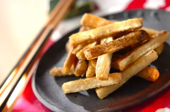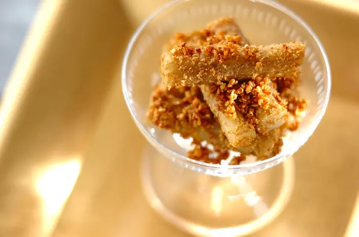 サクサク衣のゴボウの唐揚げ。調味料に漬けてから揚げると味が染みていくらでも食べられる美味しさ。。おやつやおつまみにオススメです。