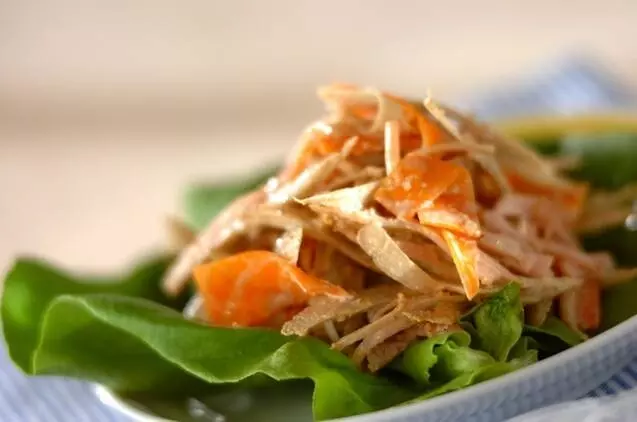 練乳が入った甘めのマヨソースに和えたゴボウのサラダ。「ささがき」にするのがポイント。ソースが染み込んで美味しさがグッとアップ。