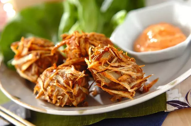 肉団子の衣にゴボウをあしらったアイデアレシピ。ピリ辛なマヨネーズと豆板醤ソース以外に、チリソースやケチャップも合いますよ。